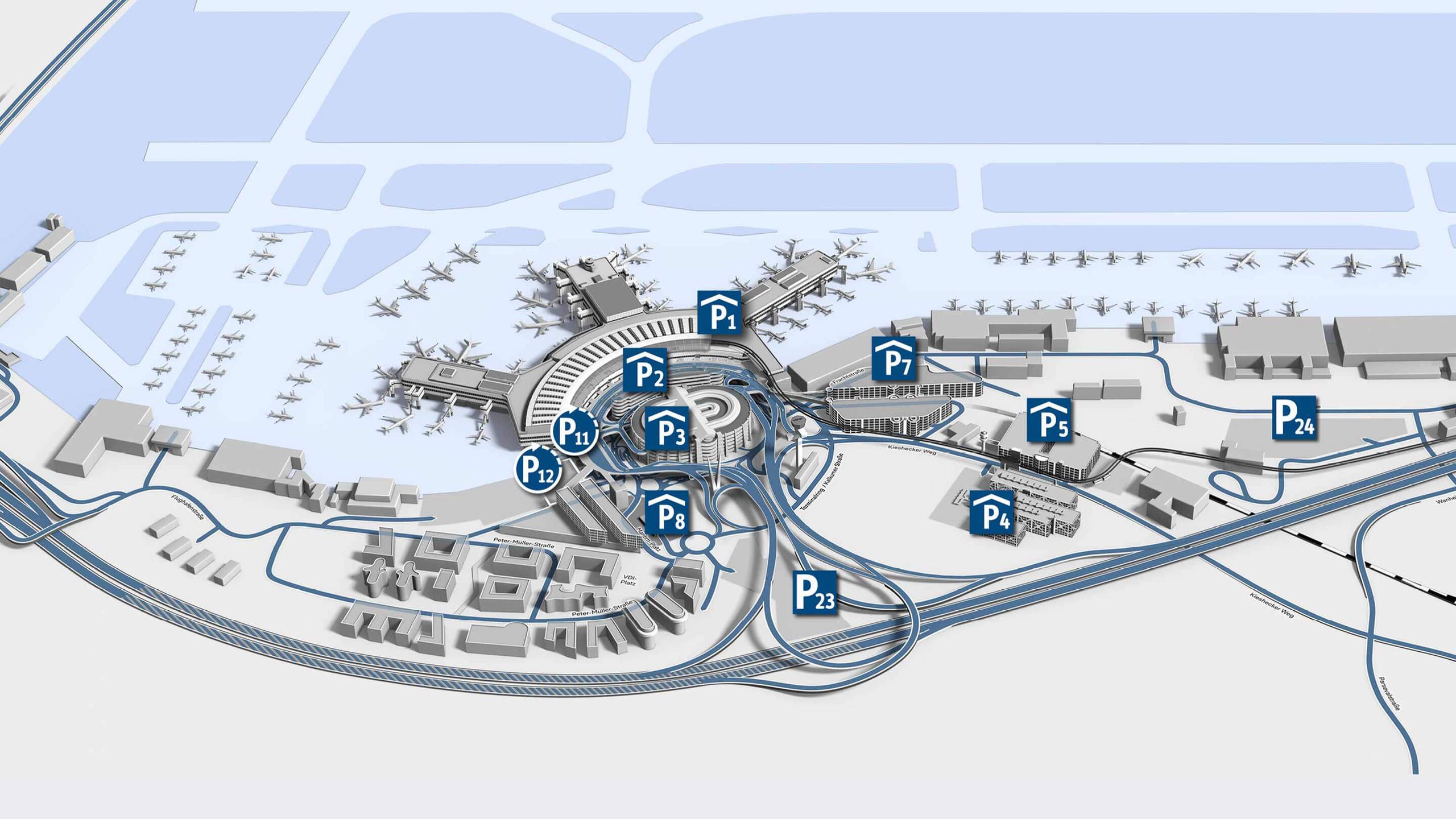 Düsseldorf: P4 en P5 zijn verbonden met de skytrain. Deze rijt vanaf 03:45 in de ochtend. Buiten deze tijden loopt u ca. 10 min naar de vertrekhal. Mocht u eerder op het vliegveld willen zijn adviseren we de garagen P7 of P8. Deze zijn direct bij het terminal met korte loopafstand gelegen.